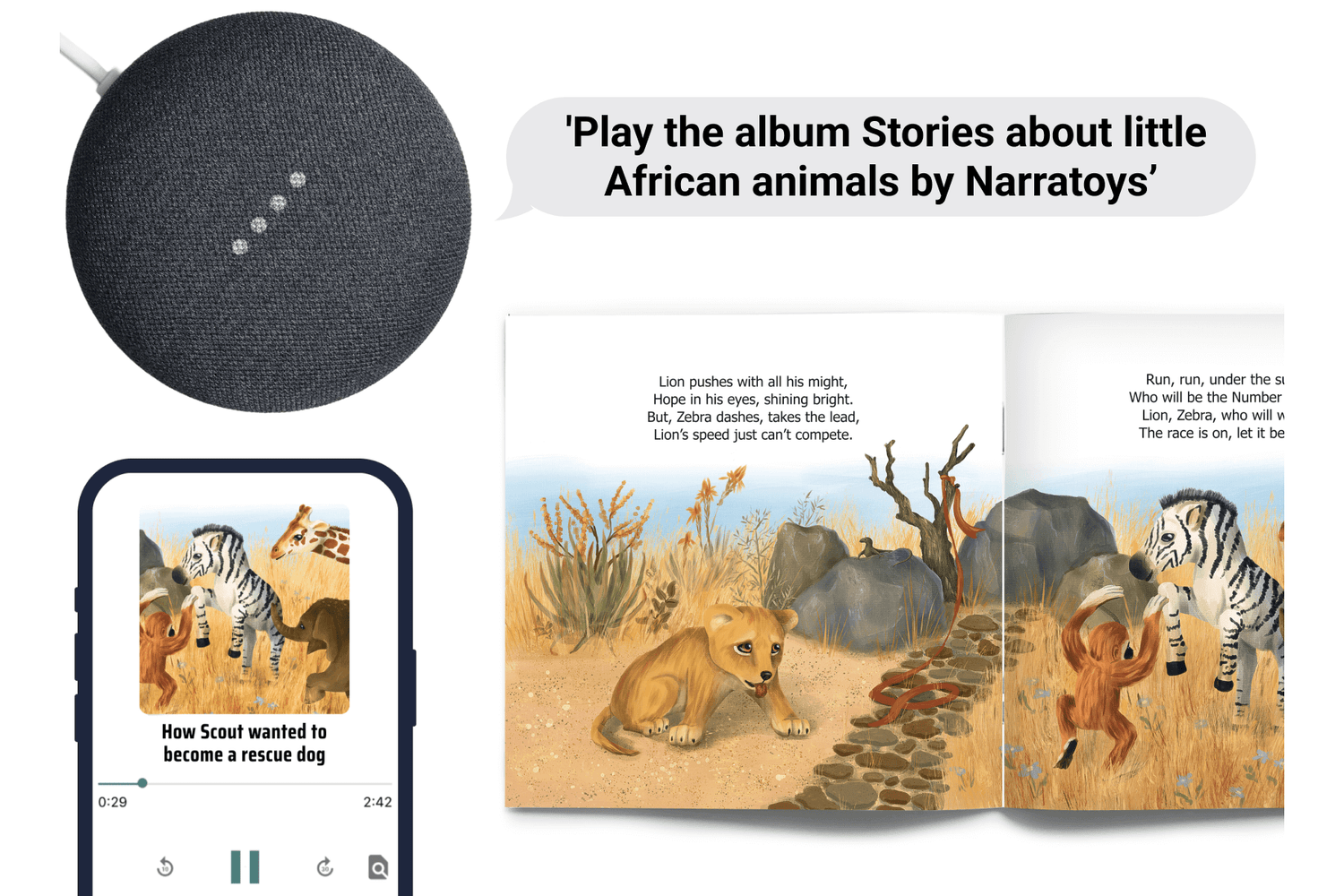 We strive to reduce children's screen time, so we decided to publish all our stories and songs on streaming services. You could give your child the mini-book and play the songs on any smart speaker. Simply say, 'Play the album Stories about little African animals by Narratoys’